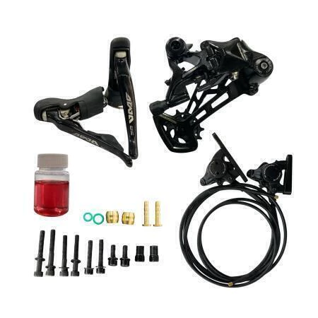 Este kit incluye cambio trasero, manijas STI hidráulicas, calipers Flat Mount y aceite, ofreciendo una solución integral para convertir o actualizar tu transmisión con un sistema 1x12 veloz, limpio y eficiente.